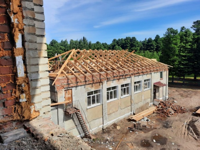 Параллельно работники подрядчика осуществляют монтаж подстропильной системы на кровле спортивного зала и обрешетки в актовом зале. В примыкающем к зданию школы холодном складе распакован фундамент, завозятся блоки для дальнейшего строительства склада.